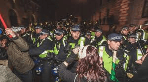 A cordon of policemen was holding back a growing crowd;